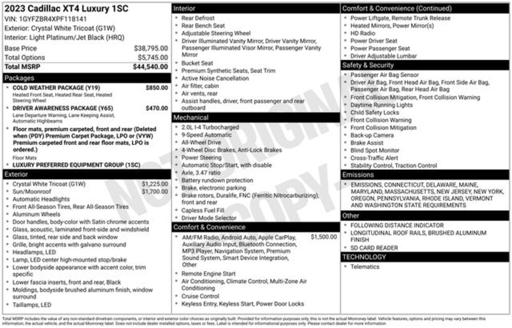 Cadillac Certified, 2-Way Driver Seat Power Lumbar Control, 2-Way Passenger Seat Power Lumbar Control, 3.47 Axle Ratio, 4-Wheel Disc Brakes, 6-Way Power Passenger Seat Adjuster, 7 Speakers, 7-Speaker Audio System w/Auxiliary Amplifier, 8-Way Power Driver Seat Adjuster, ABS brakes, Air Conditioning, Alloy wheels, AM/FM radio: SiriusXM with 360L, Apple CarPlay/Android Auto, Automatic temperature control, Bose Centerpoint Surround Sound 13-Speaker System, Brake assist, Brushed Aluminum Finish Longitudinal Roof Rails, Bumpers: body-color, Cold Weather Package, Compass, Delay-off headlights, Driver Awareness Package, Driver door bin, Driver vanity mirror, Dual front impact airbags, Dual front side impact airbags, Dual Panel Glass Sunroof w/Power Tilt/Sliding, Electronic Stability Control, Emergency communication system: OnStar and Cadillac connected services capable, Following Distance Indicator, Four wheel independent suspension, Front anti-roll bar, Front Bucket Seats, Front Center Armrest, Front dual zone A/C, Front reading lights, Fully automatic headlights, Garage door transmitter, HD Radio, Heated door mirrors, Heated Driver & Front Passenger Seats, Heated Rear Outboard Seating Positions, Heated Steering Wheel, Illuminated entry, IntelliBeam Automatic High Beam On/Off, Inteluxe Seat Trim, Knee airbag, Lane Keep Assist w/Lane Departure Warning, Leather steering wheel, Low tire pressure warning, Occupant sensing airbag, Outside temperature display, Overhead airbag, Overhead console, Panic alarm, Passenger door bin, Passenger vanity mirror, Power door mirrors, Power driver seat, Power Liftgate, Power passenger seat, Power steering, Power windows, Preferred Equipment Group 1SC, Radio data system, Radio: Cadillac User Experience AM/FM Stereo, Radio: Cadillac User Experience w/Embedded Nav, Rear anti-roll bar, Rear reading lights, Rear seat center armrest, Rear window defroster, Rear window wiper, Remote keyless entry, SD Card Reader, Security system, SiriusXM w/360L, Speed control, Speed-sensing steering, Split folding rear seat, Spoiler, Standard Suspension, Steering wheel mounted audio controls, Tachometer, Telescoping steering wheel, Tilt steering wheel, Traction control, Trip computer, Variably intermittent wipers, Voltmeter, Wheels: 18" 10-Spoke Bright Silver Finish Alloy, Wireless Apple CarPlay/Wireless Android Auto. Clean CARFAX. CARFAX One-Owner. Crystal White Tricoat 2023 Cadillac XT4 Luxury AWD 9-Speed Automatic 2.0L I4 Turbocharged