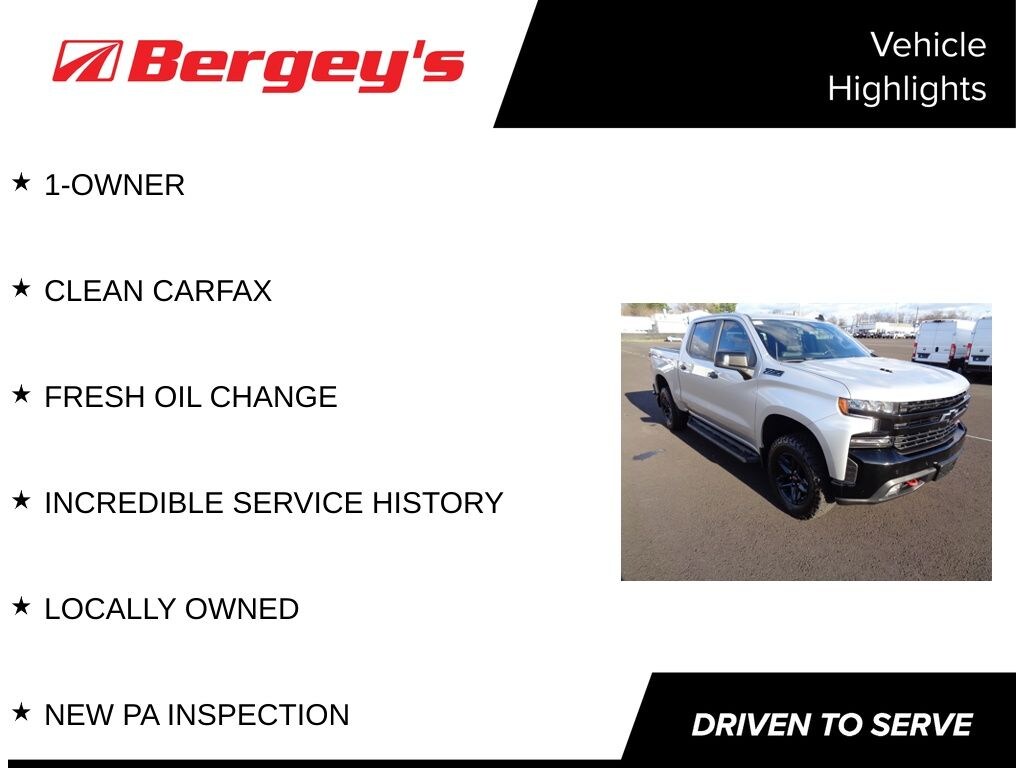 Clean CARFAX. CARFAX One-Owner. Certified. Silver Ice Metallic 2021 Chevrolet Silverado 1500 LT Trail Boss 4WD 10-Speed Automatic EcoTec3 6.2L V8 1-OWNER, CLEAN CARFAX, FRESH OIL CHANGE, INCREDIBLE SERVICE HISTORY, LOCALLY OWNED, NEW PA INSPECTION.