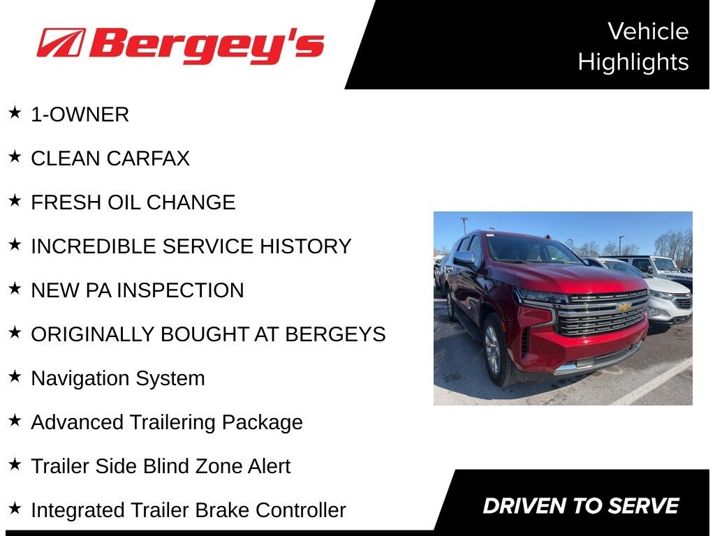 The interior of this Tahoe is equally impressive, with premium leather seating, heated and ventilated front seats, and a panoramic sunroof that floods the cabin with natural light. The Bose 10-speaker audio system and Chevrolet Infotainment 3 Premium System with navigation keep you connected and entertained on every journey.