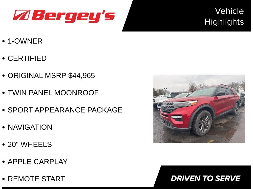 Certified. Red 2021 Ford Explorer XLT 4WD 10-Speed Automatic 2.3L EcoBoost I-4 1-OWNER, CERTIFIED, ORIGINAL MSRP $44,965, TWIN PANEL MOONROOF, SPORT APPEARANCE PACKAGE, NAVIGATION, 20" WHEELS, APPLE CARPLAY, REMOTE START, 4WD.