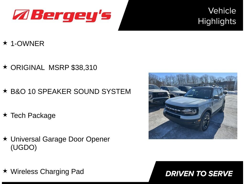 On road or off, you'll enjoy every mile in this versatile One Owner, Certified Bronco Sport Outer Banks 4X4. This SUV was sold here new at Bergey's Ford, has a clean CarFax with an extensive maintenance history here at Bergey's. The responsive 1.5L EcoBoost engine produces 181 HP and 190lb-ft of torque and is paired to a capable 4X4 G.O.A.T Mode Terrain Management System. Advanced safety technology includes Ford Co-Pilot 360 with Pre-Collision Assist with Automatic Braking, BLIS Blind Spot with Cross-Traffic Alert, Lane Keeping System, Rear View Camera, Post Collision Braking and Auto High Beam Headlamps. The Class II Trailer Tow Package accommodates your various towing applications.
