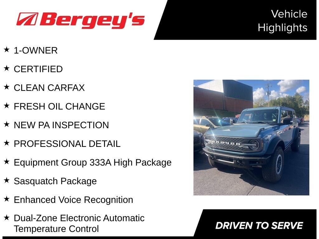 Tackling rugged terrain doesn't mean you can't be comfortable behind the wheel of this Certified, Ultra-Low mileage Bronco Badlands Sasquatch Hardtop. With just over 3,000 miles, why buy new? This Bronco has a clean CarFax. The powerful 2.7L EcoBoost V6 engine produces 330 HP and 415 lb-ft of torque, and is mated to a 10 speed automatic transmission.