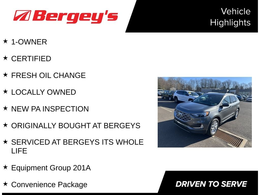 You'll appreciate the room, comfort, safety and technology in this Certified, Ultra-Low Mileage Edge SEL AWD. This Edge was purchased new at Bergey's and has a comprehensive maintenance history with us. Enter this Edge without touching the remote key fob thanks to Intelligent Access with Push Button Start. Inside you'll enjoy the heated, dual power ActiveX seats, a keyless push button start system, power windows, mirrors and locks, cruise control, and more. A large 12 inch Touchscreen features a SYNC4 Premium Audio 6 speaker entertainment system with Enhanced Voice Recognition with 911 Assist, AppLink, wireless Apple CarPlay compatibility, wireless Android Auto compatibility, digital owners manual, Over-the-Air Updates with Bluetooth and a smart charging USB port, a color rear view camera and more. Automatic halogen headlamps with wiper activation, and LED tail lamps offer enhanced visibility.