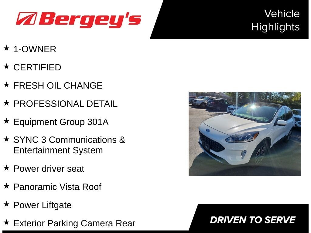 This roomy, Certified, One Owner 2022 Escape SEL AWD with a Moonroof offers versatility in a stylish design with a clean CarFax. The responsive 1.5L EcoBoost engine produces 181 HP and 190 lb-ft of torque. The impressive list of safety features includes, Blind Spot Monitoring with Cross Traffic Alert, Lane Keeping Assist, Pre-Collision Assist with Emergency Braking, Post-Collision braking and more. Enhanced safety engineering delivers a 5 star Overall Safety rating.