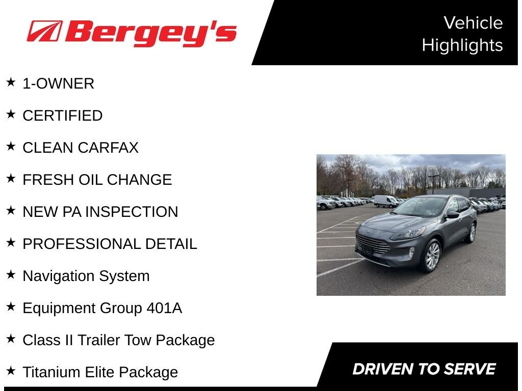 Enjoy all the latest technology, luxury and safety with this One Owner, Certified Escape Titanium Elite AWD with Navigation and a Moonroof. This low mileage SUV has a clean CarFax with a thorough Ford Dealer maintenance history. The impressive list of safety features includes Adaptive Cruise Control with Lane Centering, Blind Spot Monitoring, Lane Keeping Assist, Evasive Steering Assist, Pre-Collision Assist, Post-Collision Braking, Front Parking Sensors and more. An overall 5 Star Safety rating speaks to the emphasis on safety in this Escape.