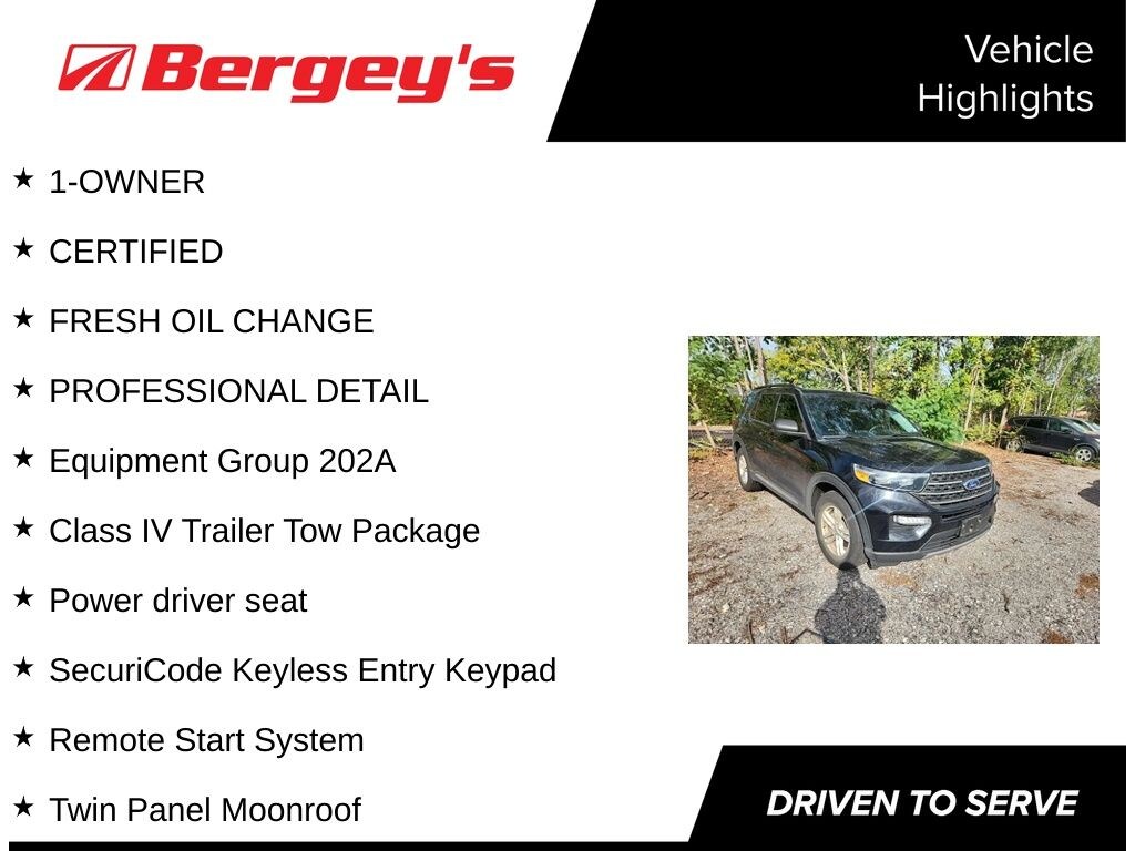 Discover distinctive style and a roomy cabin in this Certified, One Owner Explorer XLT 4WD with a Moonroof.   A responsive 2.3L EcoBoost engine delivers 300 HP and 310 lb-ft of torque and is rated at 26 MPG Highway. The Class IV Trailer Tow Package capably handles your towing needs.  The Agate Black Metallic paint is accented by the Ebony ActiveX seating.