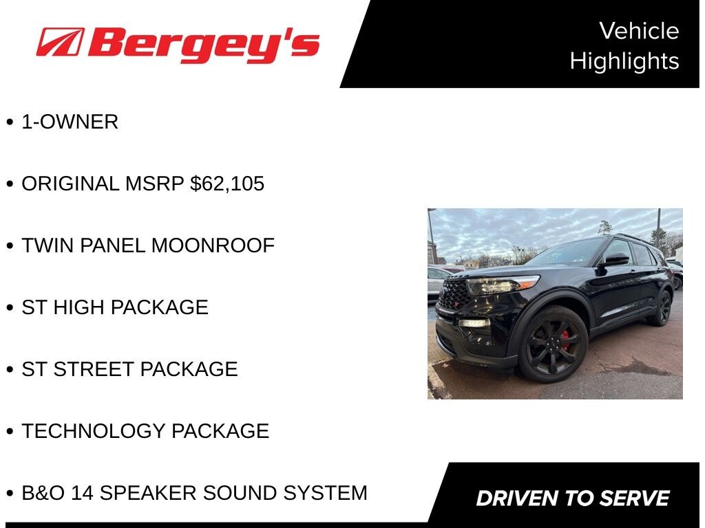Certified. Agate Black Metallic 2023 Ford Explorer ST 4WD 10-Speed Automatic 3.0L EcoBoost V6 1-OWNER, ORIGINAL MSRP $62,105, TWIN PANEL MOONROOF, ST HIGH PACKAGE, ST STREET PACKAGE, TECHNOLOGY PACKAGE, B&O 14 SPEAKER SOUND SYSTEM, 4WD.