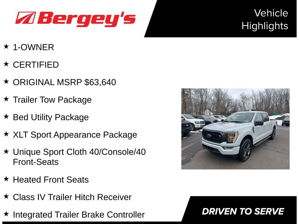 Aggressive styling and a host of features highlight this Low Mileage Certified F-150 XLT 4WD SPORT. This One Owner truck has a clean CarFax with a substantial maintenance history. Powered by the premium 2.7L EcoBoost V6 engine that produces 325 HP and 400 lb-ft of torque which makes it ideal for towing and carrying all of your passengers and their gear. The 10 speed transmission provides crisp shifts that enhance performance and economy. The Bed Utility Package includes BoxLink tie downs, LED Box Lighting and a convenient Tailgate Step, providing easy access to the cargo bed, while the Trailer Tow Package accommodates your various towing applications.