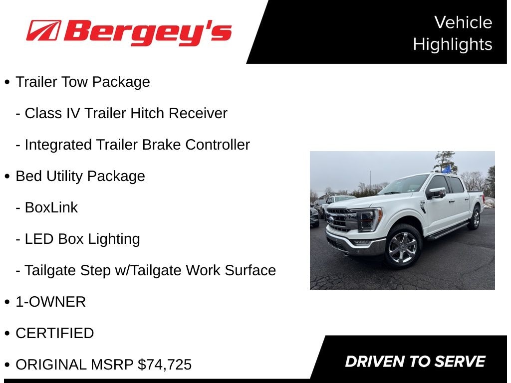 Luxury, power and capability blend seamlessly in this luxurious Certified F-150 Lariat SuperCrew 4X4 with a Moonroof. This One Owner, Low Mileage truck has a clean CarFax with a comprehensive Ford dealer maintenance history. Power is via a potent 3.5L EcoBoost V6 that produces 400 HP and 500 lb-ft of torque and is coupled to shift on the fly 4WD. The 502A Package features: Ford Co-Pilot360 Assist 2.0 , Intelligent Adaptive Cruise Control Stop-and-Go Lane Centering Speed Sign Recognition , Evasive Steering Assist , Intersection Assist , Connected Built-In Navigation, Second-row heated seats , Power Tilt/Telescoping Steering Column with Memory ,LED Projector with Dynamic bending Headlamps w/ LED Tail lamps ,Rain-Sensing Wipers , and a Wireless Charging Pad. The Trailer Tow Package accommodates your various towing applications, while stunning 20 inch Chrome Wheels add distinctive style.The cargo bed is protected by a Bedliner and Tonneau Cover.
