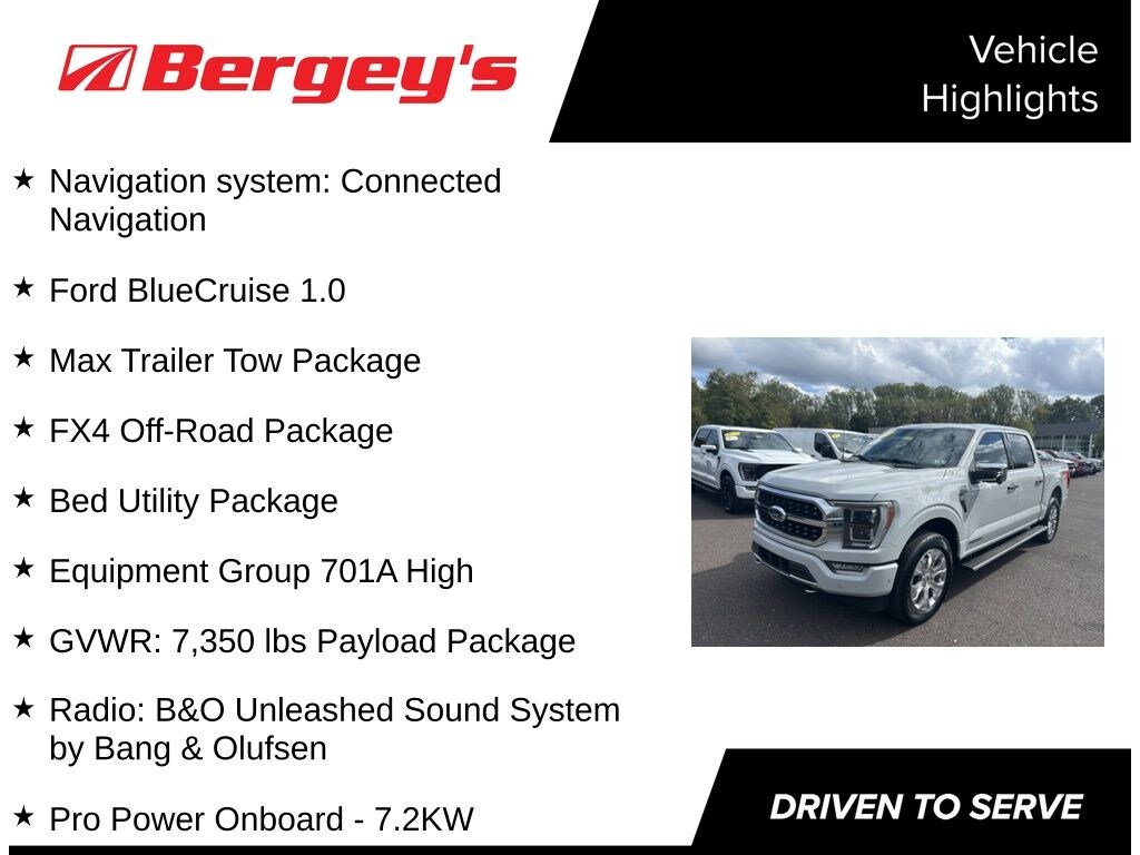 Dual heated and ventilated 10 way powered seats are covered in supple leather and feature memory settings, while rear seat passengers enjoy heated seats as well. Power adjustable pedals and steering wheel make getting comfortable a snap. The large 12 inch SYNC 4 touch screen with Navigation provides a variety of entertainment choices including Sirius radio and BlueTooth connectivity as well as a large color rear camera. The high-content 701A Package includes a Premium B&O Unleashed 18 speaker audio system, LED Box Lighting, a Tailgate Step, Power Tailgate, Ford BlueCruise, and a 360 Degree Camera Package.