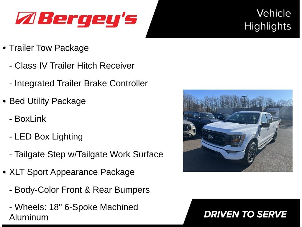 Certified. Oxford White 2023 Ford F-150 XLT 4WD 10-Speed Automatic 2.7L V6 EcoBoost CERTIFIED, 4WD, Accent-Color Step Bars, Bed Utility Package, Black 2-Bar Style Grille w/Black Surround/Accents, Body-Color Door & Tailgate Handles, Body-Color Front & Rear Bumpers, Box Side Decals, BoxLink, Class IV Trailer Hitch Receiver, Integrated Trailer Brake Controller, LED Box Lighting, Pro Trailer Backup Assist & Pro Trailer Hitch Assist, Tailgate Step w/Tailgate Work Surface, Trailer Tow Package, Unique Sport Cloth 40/Console/40 Front-Seats, Wheels: 18" 6-Spoke Machined Aluminum, XLT Sport Appearance Package, Zone Lighting.