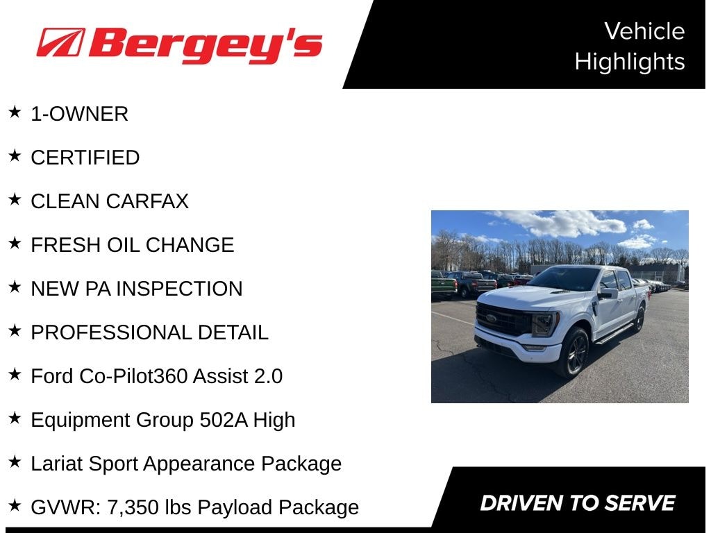 Don't settle for just any truck when you can drive this luxurious Certified F-150 Lariat SPORT HYBRID 4X4 with a Moonroof. This One Owner truck has a clean CarFax. Powered by Fords premier 3.5L PowerBoost Full Hybrid engine, rated 430 HP and an incredible 570 lb-ft of torque, along with shift on the fly 4WD, you'll be ready for any road or off road - situation. The Black Sport Package offers stunning 20 inch Gloss Black Alloy Wheels, sport exterior accents and Black Leather Bucket Seats.