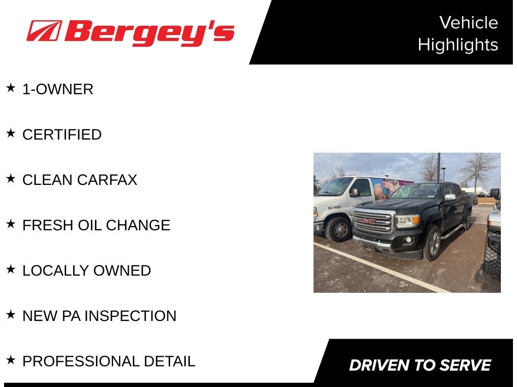 Recent Arrival! Clean CARFAX. CARFAX One-Owner. Certified. Onyx Black 2016 GMC Canyon SLT 4WD 6-Speed Automatic 3.6L V6 DGI DOHC VVT 1-OWNER, CERTIFIED, CLEAN CARFAX, FRESH OIL CHANGE, LOCALLY OWNED, NEW PA INSPECTION, PROFESSIONAL DETAIL.