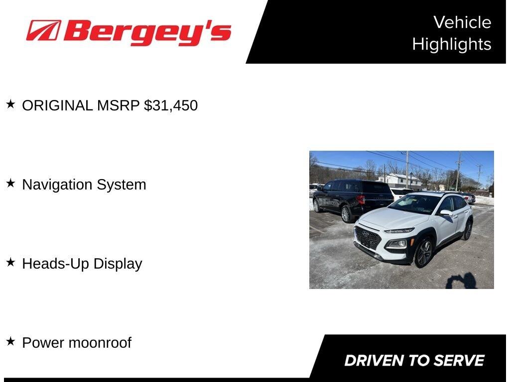 Contemporary styling, advanced technology and an impressive list of features highlight this Certified Hyundai Kona Ultimate AWD Hatchback with a Sunroof and Heads-Up Display. 1.6L Turbocharged Engine is rated at 29 MPG Highway and is paired with an automatic AWD system. The premium Chalk White exterior is accented by the Black Leather Seating.