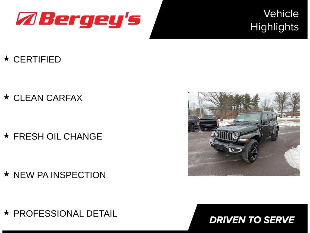 Clean CARFAX. CARFAX One-Owner. Certified. Black Clearcoat 2025 Jeep Wrangler Sahara 4xe 4WD 8-Speed Automatic 2.0L I4 DOHC CERTIFIED, CLEAN CARFAX, FRESH OIL CHANGE, NEW PA INSPECTION, PROFESSIONAL DETAIL.