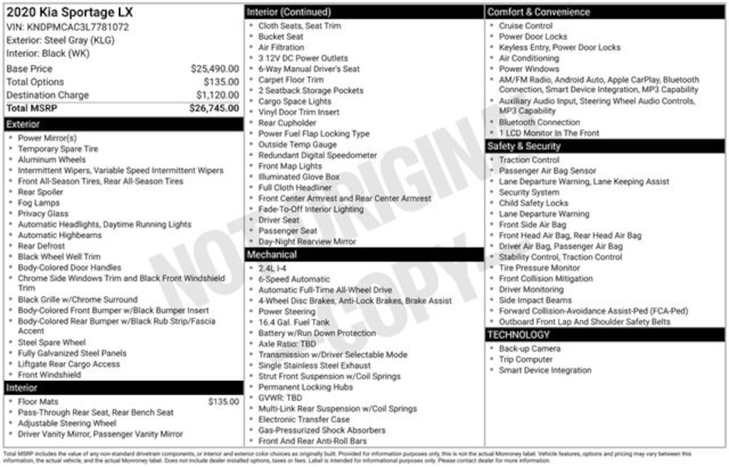 Certified. Steel Gray 2020 Kia Sportage LX AWD 6-Speed Automatic Electronic with Overdrive 2.4L I4 DGI DOHC 16V AWD.