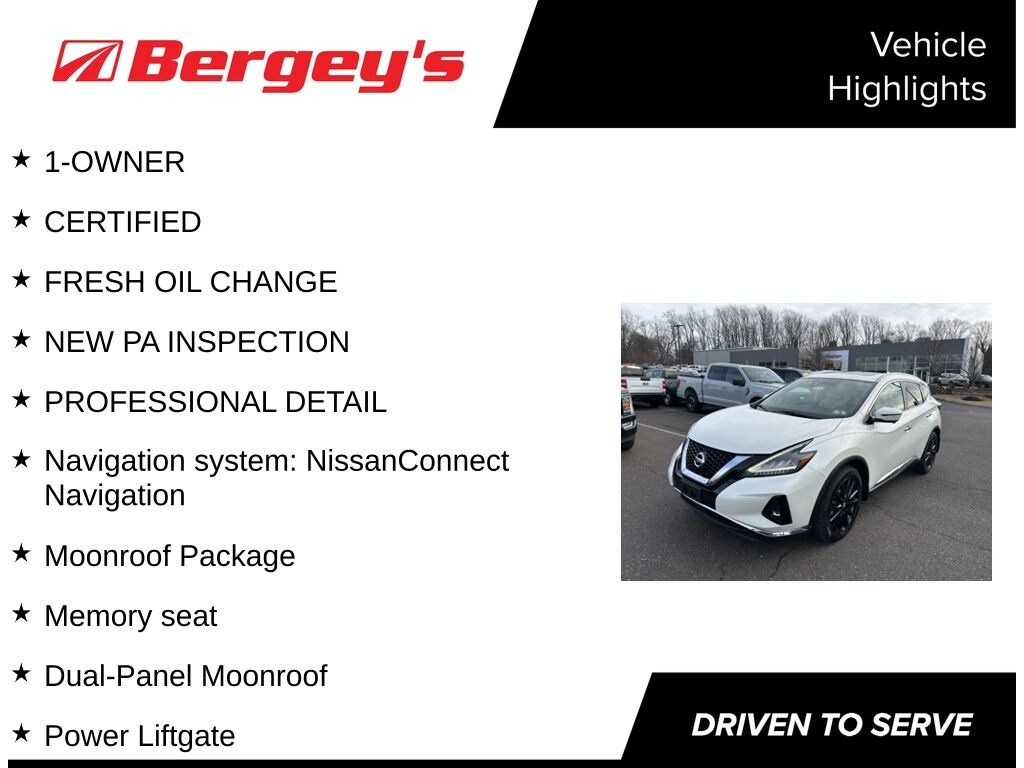 Standard features include, Traffic Sign Recognition, Intelligent Around View Monitor, Front and rear sonar system, Silver roof rails, LED fog lights, Power heated outside mirrors with LED turn signal indicators and reverse tilt-down feature, Motion Activated Liftgate, Drivers seat and outside mirrors position memory, Leather appointed seats, Heated front and rear seats, Heated steering wheel, Adjustable ambient LED interior lighting, Bose Premium Audio System with 11 speakers, including dual subwoofers, Android Auto and Apple CarPlay, Sirius XM Nissan Door to Door Navigation with Premium Traffic System.