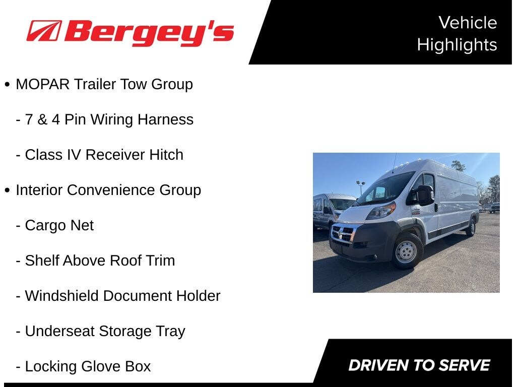 Optional equipment includes Vinyl Bucket Seats, Trailer Tow Group and 4 Pin Trailer Tow Wiring Harness, Class IV Receiver Hitch, Interior Convenience Group, Cargo Net, Overhead Storage Shelf, Driver A-Pillar Document Holder, Underseat Storage Tray, Locking Glove Box, Premium Appearance Group, Fog Lamps, Chrome Grille, 220-Amp Alternator, Wood Composite Floor, Wide Power Heated Mirrors, 96-Inch Extended Exterior Mirror, 12-Volt Rear Auxiliary Power Outlet, GPS Navigation, LED Cargo Area Light Bars, Daytime Running Headlamp, Uconnect 5.0  GPS, Steering Wheel Mounted Audio Controls, 5.0-Inch Touchscreen Display, Media Hub (USB, Aux), Integrated Voice Command with Bluetooth, SiriusXM Sat Radio, and the ParkView Rear Back Up Camera