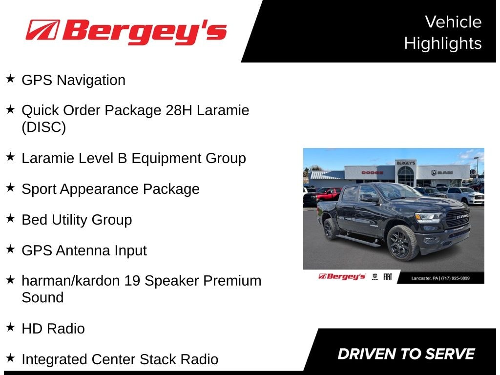 Certified. Diamond Black Crystal Pearlcoat 4D Crew Cab CARFAX One-Owner. 2023 Ram 21/29 City/Highway MPG 1500 Laramie 4WD 8-Speed Automatic EcoDiesel 3.0L V6 12" Touchscreen Display, 2nd Row In Floor Storage Bins, 3.92 Rear Axle Ratio, 4G LTE Wi-Fi Hot Spot, Apple CarPlay, Auto High Beam Headlamp Control, Bed Utility Group, Black Interior Accents, Blind Spot & Cross Path Detection, Body Color Exterior Mirrors, Body Color Front Bumper, Body Color Premium Power Mirrors, Body Color Rear Bumper w/Step Pads, Class IV Receiver Hitch, Connected Travel & Traffic Services, Connectivity - US/Canada, Disassociated Touchscreen Display, Dome Dual LED Reading Lamp, Driver Seat Memory, Dual-Pane Panoramic Sunroof, Electric Shift-On-Demand Transfer Case, Foam Bottle Insert (Door Trim Panel), For Details, Visit DriveUconnect.com, For More Info, Call 800-643-2112, Front Door Accent Lighting, Front LED Fog Lamps, Global Telematics Box Module (TBM), Google Android Auto, GPS Antenna Input, GPS Navigation, Grille Surround 3 Body Color Tex 2 Black, harman/kardon 19 Speaker Premium Sound, HD Radio, Heated Front Seats, Heated front seats, Integrated Center Stack Radio, Integrated Voice Command w/Bluetooth, Laramie Level B Equipment Group, Leather Trim 40/20/40 Bench Seat, LED Dome/Reading Lamp, LED Reflector Headlamps, MOPAR 4 Adjustable Cargo Tie-Down Hooks, MOPAR Spray In Bedliner, ParkSense Front/Rear Park Assist w/Stop, ParkSense Front/Rear Park Assist w/Stop (DISC), ParkView Rear Back-Up Camera, Pick-Up Box Lighting, Power 8-Way Driver & Passenger Seats, Power driver seat, Power passenger seat, Quick Order Package 28H Laramie (DISC), Radio: Uconnect 5 Nav w/12.0" Display, Rain Sensitive Windshield Wipers, RAM Grille Badge - Chrome, Rear Door Accent Lighting, Rear Power Sliding Window, Rear Underseat Compartment Storage, Rear Window Defroster, Remote Tailgate Release, SiriusXM Radio Service, SiriusXM w/360L, Sport Appearance Package, Sport Decal, Sport Performance Hood, Trailer Brake Control, USB Host Flip, Ventilated Front Seats, Ventilated front seats, Wheels: 22" x 9" Forged Aluminum.