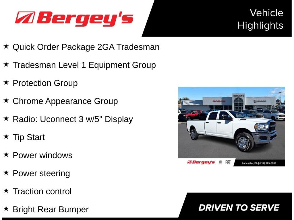 Certified. Bright White Clearcoat 4D Crew Cab 2023 Ram 2500 Tradesman 4WD 8-Speed Automatic 6.4L V8 Anti-Spin Differential Rear Axle, Brake assist, Bright Front Bumper, Bright Rear Bumper, Center Hub, Chrome Appearance Group, Chrome Grille Surround, Chrome Headlamp Bezels, Electronic Stability Control, Manual Folding Exterior Mirrors, Manual Telescoping Mirrors, Matte Black Mesh Grille w/Chrome, MOPAR Spray In Bedliner, ParkView Rear Back-Up Camera, Power steering, Power windows, Protection Group, Quick Order Package 2GA Tradesman, Radio: Uconnect 3 w/5" Display, Rear step bumper, Tip Start, Tow Hooks, Traction control, Tradesman Level 1 Equipment Group, Trailer Brake Control, Trailer Light Check, Wheels: 18" x 8.0" Steel Chrome Clad.