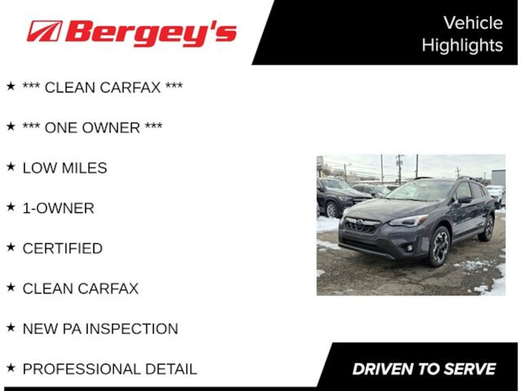 *** CLEAN CARFAX ***, *** ONE OWNER ***, LOW MILES, 1-OWNER, CERTIFIED, CLEAN CARFAX, NEW PA INSPECTION, PROFESSIONAL DETAIL, harman/kardon Speaker System, Moonroof Package 2, Power Moonroof, Radio: Subaru STARLINK 8.0" Multimedia Nav System, Subaru STARLINK Smartphone Integration. Certified. Certification Program Details: *6-Month/6,000-Mile Bumper-to-Bumper Limited Warranty*, whichever comes first, in addition to any remaining original factory Bumper-to-Bumper warranty. See participating dealer and warranty booklet for limited warranty eligibility and coverage details, including limitations and exclusions. *Except for non-GM vehicles in the State of California, where coverage will be provided by a vehicle service contract. Priced below KBB Fair Purchase Price! Odometer is 24576 miles below market average!