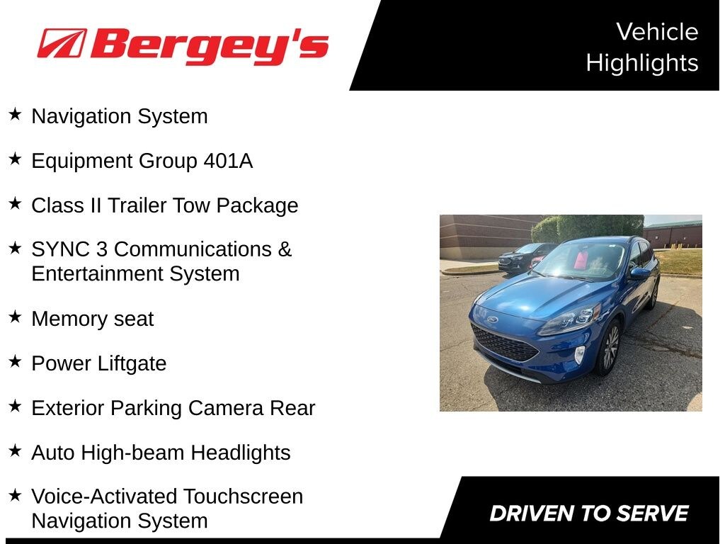 Enjoy all the latest technology, luxury and safety with this One Owner Escape Titanium AWD with Navigation. The impressive list of safety features includes Adaptive Cruise Control with Lane Centering, Blind Spot Monitoring, Lane Keeping Assist, Evasive Steering Assist, Pre-Collision Assist, Post-Collision Braking, Front Parking Sensors and more. An overall 5 Star Safety rating speaks to the emphasis on safety in this Escape.