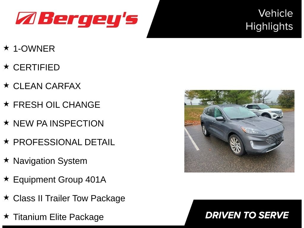 Enjoy all the latest technology, luxury and safety with this One Owner, Certified Escape Titanium Elite AWD with Navigation and a Moonroof.  This low mileage SUV has a clean CarFax with a thorough Ford Dealer maintenance history. The impressive list of safety features includes Adaptive Cruise Control with Lane Centering, Blind Spot Monitoring, Lane Keeping Assist, Evasive Steering Assist, Pre-Collision Assist, Post-Collision Braking, Front Parking Sensors and more. An overall 5 Star Safety rating speaks to the emphasis on safety in this Escape.