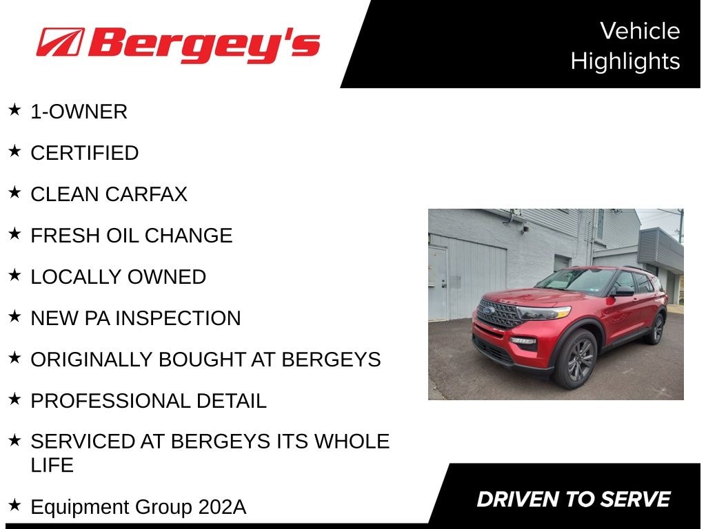 Dramatic sporty styling is paired with impressive features in this Certified Explorer XLT Sport 4WD with a Moonroof and Navigation. This One Owner, Low Mileage SUV was purchased new here at Bergeys and has a clean CarFax. A responsive 2.3L EcoBoost engine delivers 300 HP and 310 lb-ft of torque. The Class IV Trailer Tow Package capably handles your towing needs. Enhanced safety engineering includes Ford Co-Pilot360 Assist+, Adaptive Cruise Control, BLIS blind spot monitoring, Lane-Keeping Assistance and LED Signature Lighting that delivers a 5 star Overall Safety rating. The Twin Panel Moonroof offers abundant light.