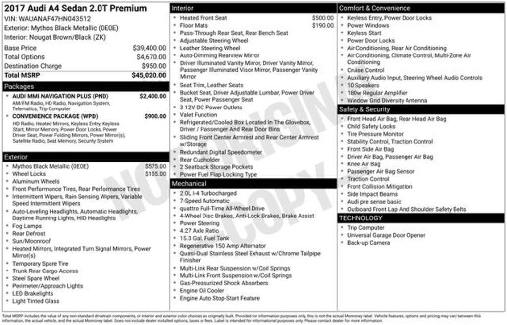 Black 2017 Audi A4 2.0T Premium quattro quattro 7-Speed Automatic S tronic 2.0L I4 TFSI DOHC 7-Speed Automatic S tronic, quattro, Nougat Brown/Black Leather.