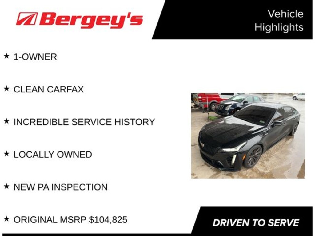 Cadillac Certified Pre-Owned Certified, Navigation System, 16 Speakers, 3 USB Ports, 4-Wheel Disc Brakes, ABS brakes, Adaptive Cruise Control, Adaptive Remote Start, Adaptive suspension, Air Conditioning, AKG Premium 16-Speaker System, All-Weather Cargo Mat (LPO), All-Weather Floor Mats, Alloy wheels, AM/FM radio: SiriusXM with 360L, Apple CarPlay/Android Auto, Auto High-beam Headlights, Auto-dimming door mirrors, Auto-dimming Rear-View mirror, Automatic Emergency Braking, Automatic temperature control, Automatic Vehicle Hold Brake, Black Wheel Locks (LPO), Black Wheel Lug Nuts (LPO), Brake assist, Brembo 4-Wheel Antilock Performance Disc Brakes, Buckle to Drive, Bumpers: body-color, Compass, Delay-off headlights, Driver 4-Way Power Lumbar Seat Adjuster, Driver Assist Package, Driver door bin, Driver Power Lumbar Massage Seat, Driver vanity mirror, Dual front impact airbags, Dual front side impact airbags, Electronic Cruise Control w/Set & Resume Speed, Electronic Precision Shift, Electronic Stability Control, Emergency communication system: OnStar and Cadillac connected services capable, Enhanced Automatic Emergency Braking, Exterior Parking Camera Rear, Four wheel independent suspension, Front & Rear Park Assist, Front 2-Way Adjustable Head Restraints, Front anti-roll bar, Front Bucket Seats, Front Center Armrest, Front dual zone A/C, Front Passenger 4-Way Power Lumbar Seat Adjuster, Front Passenger Power Lumbar Massage Seat, Front reading lights, Front Splitter, Fully automatic headlights, Garage door transmitter, HD Radio, Heads-Up Display, Heated door mirrors, Heated Driver & Front Passenger Seats, Heated front seats, Heated steering wheel, High Performance Front Bucket Seats, Illuminated entry, Inside Rear-View Auto-Dimming Mirror, Interior Protection Package (LPO), Knee airbag, Lane Keep Assist w/Lane Departure Warning, Leather Seating Surfaces w/Mini-Perforated Inserts, Leather steering wheel, Leather-Wrapped Thick Rim Steering Wheel, Low tire pressure warning, Memory seat, Occupant sensing airbag, Outside temperature display, Overhead airbag, Overhead console, Panic alarm, Passenger door bin, Passenger vanity mirror, Performance Front Bucket Seats, Power door mirrors, Power driver seat, Power passenger seat, Power steering, Power windows, Preferred Equipment Group 1SV, Radio data system, Radio: Cadillac User Experience w/Embedded Nav, Rain sensing wipers, Rear anti-roll bar, Rear reading lights, Rear seat center armrest, Rear window defroster, Red Front & Rear Calipers, Remote keyless entry, Reverse Automatic Braking, Security system, SiriusXM w/360L, Speed control, Speed-sensing steering, Split folding rear seat, Spoiler, Steering wheel memory, Steering Wheel Mounted Alloy Paddle Shift Controls, Steering wheel mounted audio controls, Sueded Microfiber-Wrapped Interior Trim Package, Tachometer, Teen Driver, Telescoping steering wheel, Tilt steering wheel, Tire Inflator Kit, Torch Red Seat Belt Color, Traction control, Trip computer, Turn signal indicator mirrors, UltraView Dual Pane Sunroof, Variably intermittent wipers, Ventilated Driver & Front Passenger Seats, Ventilated front seats, Voltmeter, Wheels: 19" Alum Alloy w/Polished/Dk Android Finish, Wheels: 19" Alum Alloy w/Satin Graphite Dk Finish, 1-OWNER, CLEAN CARFAX, INCREDIBLE SERVICE HISTORY, LOCALLY OWNED, NEW PA INSPECTION, ORIGINAL MSRP $104,825, Navigation System. Clean CARFAX. CARFAX One-Owner. Black Raven 2023 Cadillac CT5 V-Series RWD 10-Spee