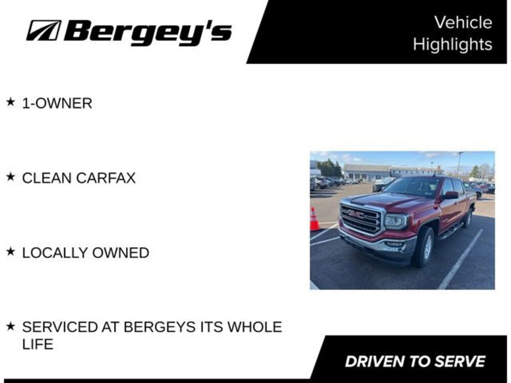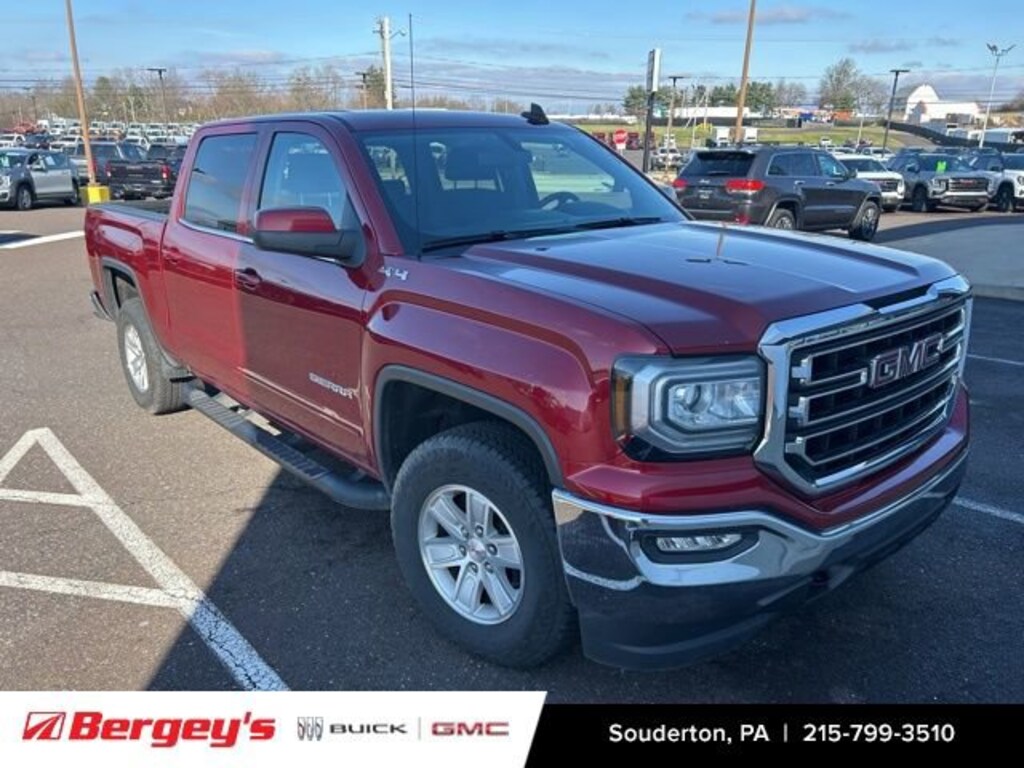 Discover the power and versatility of the 2018 GMC Sierra 1500 SLE. This exceptional truck combines rugged capability with refined comfort, making it the perfect companion for your next adventure.Boasting an impressive list of features, this Sierra 1500 SLE stands out from the crowd. Key highlights include:- 1-OWNER- CLEAN CARFAX- LOCALLY OWNED- SERVICED AT BERGEYS ITS WHOLE LIFE- Seat Adjuster, Driver 10-Way Power- Red Quartz Tintcoat Exterior- Audio System with 8 Diagonal Color Touch Screen Navigation and GMC Infotainment- Trailer Brake Controller, Integrated- Heated Driver and Front Passenger Seats- 5.3L V8 EcoTec3 Engine with Active Fuel Management and Variable Valve TimingThe Sierra 1500 SLE's powerful 5.3L V8 EcoTec3 engine delivers an exceptional blend of performance and efficiency, with more than 300 lb-ft of torque available from 2,000 to 5,600 rpm. Paired with a 6-speed automatic transmission and 4-wheel drive, this truck is ready to take on any task, whether it's hauling heavy loads or navigating rugged terrain.Inside, the Sierra 1500 SLE offers a spacious and well-appointed cabin, with features like dual-zone automatic climate control, a 110-volt power outlet, and a premium audio system with navigation and Bluetooth connectivity. The heated front seats and 10-way power driver's seat ensure maximum comfort, while the integrated trailer brake controller and trailering equipment make towing a breeze.With its sleek Red Quartz Tintcoat exterior, this Sierra 1500 SLE not only looks great, but it's also built to last. The locally-owned and serviced vehicle comes with a clean CARFAX report, giving you peace of mind in your purchase.If you're in the market for a capable, well-equipped, and versatile truck, the 2018 GMC Sierra 1500 SLE is an excellent choice. Visit our showroom today to experience this impressive vehicle firsthand and discover how it can enhance your driving experience.