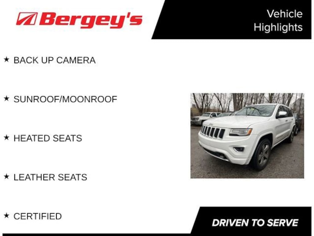 Recent Arrival! BACK UP CAMERA, SUNROOF/MOONROOF, HEATED SEATS, LEATHER SEATS, CERTIFIED, 4WD. Certified. Certification Program Details: *30-day/1,000-mile Powertrain Limited Warranty*, whichever comes first, from original in-service date. See participating dealer and warranty booklet for limited warranty eligibility and coverage details, including limitations and exclusions. *Except for non-GM vehicles in the State of California, where coverage will be provided by a vehicle service contract. Odometer is 8086 miles below market average!2015 Bright White Clearcoat Jeep Grand Cherokee 4WD 3.6L V6 24V VVT 8-Speed Automatic Reviews:* Strong and fuel-efficient engine lineup, including diesel V6; upscale interior; plenty of luxury and technology-oriented features; irrefutable off-road ability; outlandish SRT model. Source: Edmunds