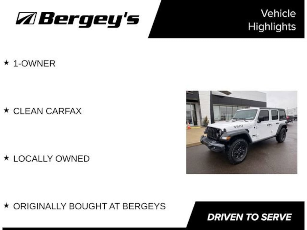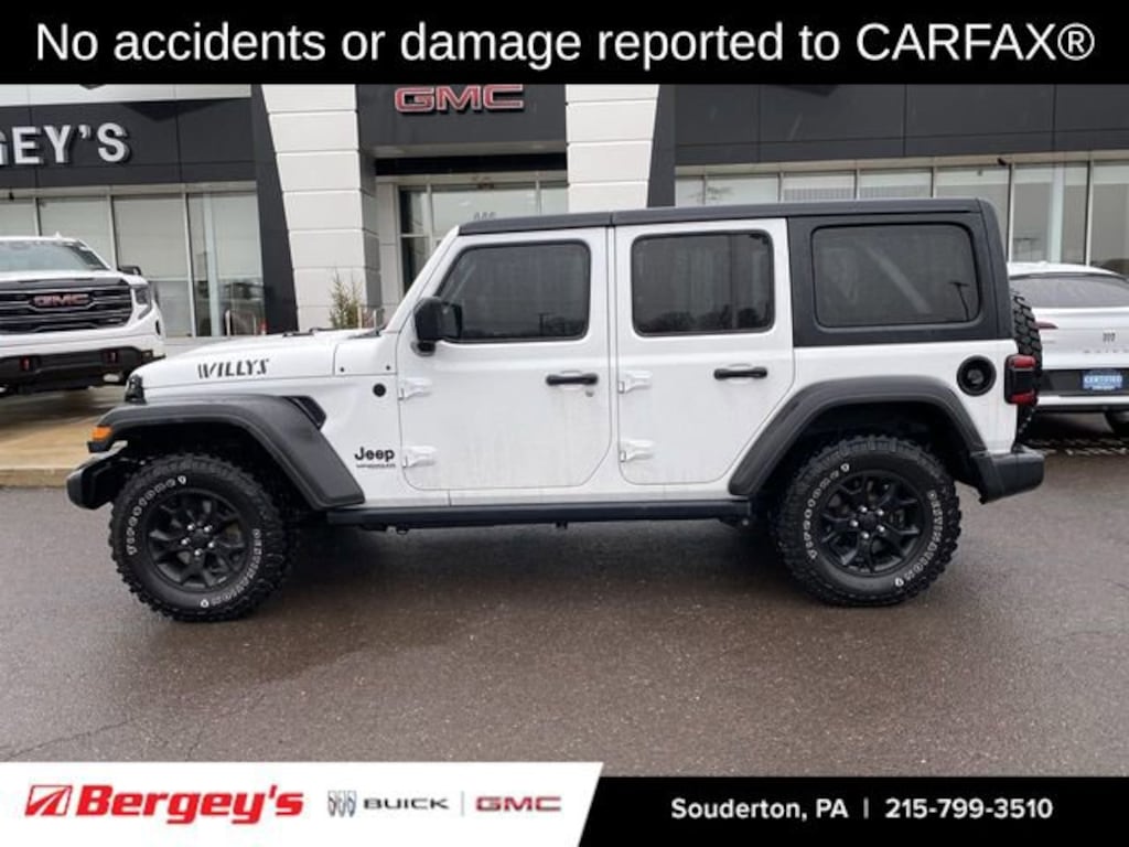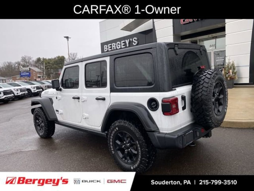 Discover the ultimate adventure-ready SUV with the 2021 Jeep Wrangler Unlimited Willys. This exceptional off-road icon combines rugged capability, modern technology, and uncompromising style, making it the perfect companion for your next outdoor excursion.Boasting a distinguished one-owner history and a clean CARFAX report, this Wrangler Unlimited Willys was originally purchased at Bergey's and has been meticulously maintained. Its striking white exterior, complemented by the Willys-inspired design elements, exudes a bold and confident presence that's sure to turn heads. Under the hood, the powerful 2.0L I4 DOHC turbocharged engine, paired with an 8-speed automatic transmission and 4-wheel drive, delivers the performance and capability you demand.- 1-OWNER- CLEAN CARFAX- LOCALLY OWNED- ORIGINALLY BOUGHT AT BERGEYS- QUICK ORDER PACKAGE 22W WILLYS- BLACK 3-PIECE HARD TOP- COLD WEATHER GROUP (HEATED STEERING WHEEL, HEATED FRONT SEATS)- TECHNOLOGY GROUP (UCONNECT 4 WITH 7 DISPLAY, ANDROID AUTO, APPLE CARPLAY, SATELLITE RADIO)- SAFETY GROUP (BLIND SPOT & CROSS PATH DETECTION, REAR PARK ASSIST)- TRAILER TOW & HD ELECTRICAL GROUP- CONVENIENCE GROUP (UNIVERSAL GARAGE DOOR OPENER)This Wrangler Unlimited Willys is more than just a capable off-road machine; it's a true statement of your adventurous spirit. The rugged exterior, combined with the premium interior features, creates a driving experience that seamlessly blends modern convenience with uncompromising Jeep heritage.Imagine conquering the trails with confidence, thanks to the advanced 4-wheel drive system and the included Trailer Tow & HD Electrical Group. Enjoy the comfort of heated front seats and a heated steering wheel during those chilly winter excursions, courtesy of the Cold Weather Group. Stay connected and entertained with the cutting-edge Uconnect 4 system, complete with Apple CarPlay, Android Auto, and SiriusXM satellite radio.Safety is also a top priority, with features like Blind Spot & Cross Path Detection and the Rear Park Assist System ensuring you navigate the road with added peace of mind.Whether you're tackling the great outdoors or simply navigating the urban jungle, the 2021 Jeep Wrangler Unlimited Willys is the ultimate expression of freedom and capability. Experience the thrill of Jeep ownership and schedule a test drive today. We're confident this exceptional SUV will exceed your expectations and become the perfect companion for your next adventure.