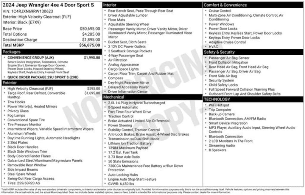 High Velocity Clearcoat 2024 Jeep Wrangler Sport S 4xe 4WD 8-Speed Automatic 2.0L I4 DOHC 1-OWNER, FRESH OIL CHANGE, NEW PA INSPECTION, PROFESSIONAL DETAIL, 2.0L I4 DOHC.