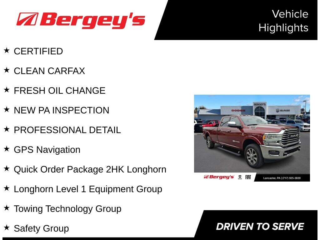 Delmonico Red Pearlcoat 4D Crew Cab 2021 Ram 2500 Longhorn 4WD 6-Speed Automatic Cummins 6.7L I6, CLEAN CARFAX, FRESH OIL CHANGE, NEW PA INSPECTION, PROFESSIONAL DETAIL, 1-Year SiriusXM Guardian Trial, 12" Touchscreen Display, 17 Speaker harman kardon Premium Sound, 220 Amp Alternator, 4G LTE Wi-Fi Hot Spot, Adaptive Cruise Control w/Stop, Adaptive Steering System, Air Suspension Decal, Apple CarPlay, Auto Level Rear Air Suspension, Blind Spot & Cross Path Detection, Cold Weather Group, CTR Stop Lamp w/Cargo View Camera, Digital Rearview Mirror, Disassociated Touchscreen Display, Engine Block Heater, Full Speed Forward Collision Warning Plus, Google Android Auto, GPS Antenna Input, GPS Navigation, HD Radio, Heavy Duty Snow Plow Prep Group, Integrated Voice Command w/Bluetooth, Lane Keep Assist, Longhorn Level 1 Equipment Group, MOPAR Winter Front Grille Cover, ParkView Rear Back-Up Camera, Power Deployable Running Boards, Power Sunroof, Protection Group, Quick Order Package 2HK Longhorn, Radio: Uconnect 12.0 w/Navigation, Ramcharger Wireless Charging Pad, Safety Group, SiriusXM Satellite Radio, SiriusXM Traffic Plus, SiriusXM Travel Link, SiriusXM w/360L, Surround View Camera System, Tow Hooks, Towing Technology Group, Trailer Reverse Guidance, Wheels: 18" x 8.0" Polished Aluminum.