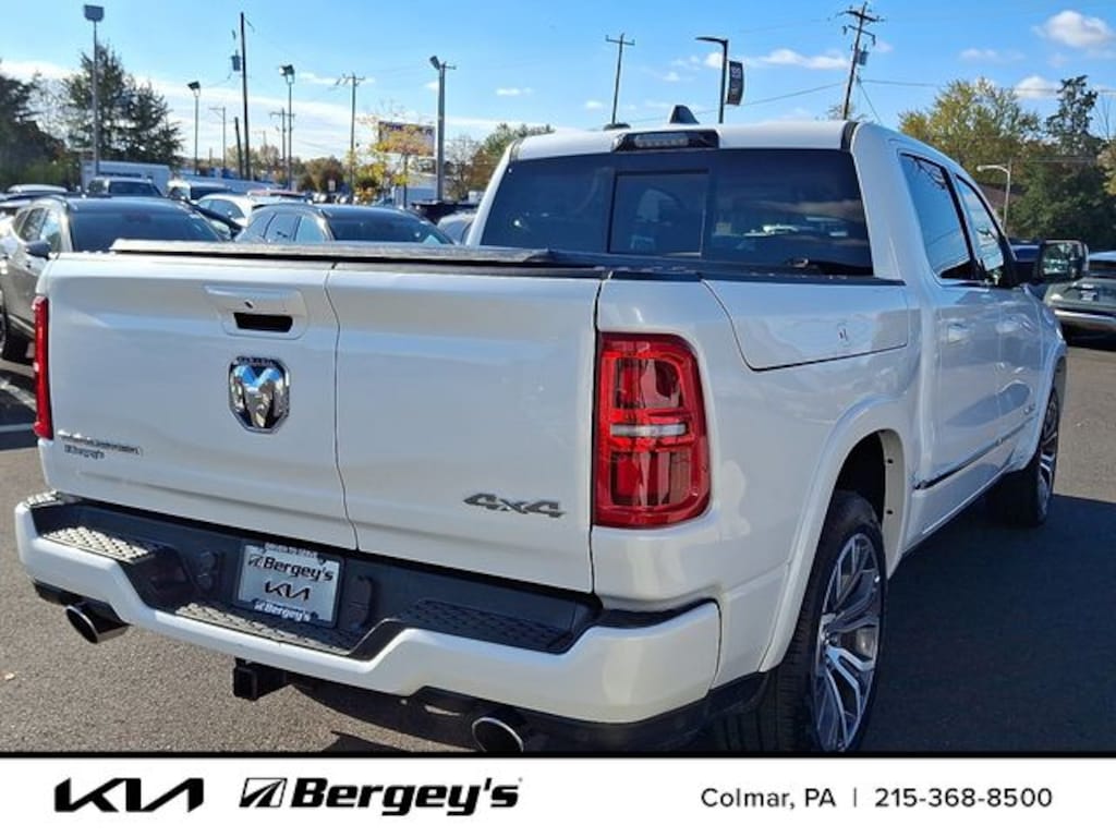 Ivory White Tri-Coat Pearlcoat 2025 Ram 1500 Tungsten 4WD 8-Speed Automatic 3.0L I6 12-Way/1-Way Trailer Connector, 3.92 Rear Axle Ratio, 4-Wheel Disc Brakes, ABS brakes, Adjustable pedals, Air Conditioning, Alloy wheels, AM/FM radio: SiriusXM with 360L, Apple CarPlay/Android Auto, Audio memory, Auto High-beam Headlights, Auto Power-Folding Mirrors, Auto-dimming door mirrors, Auto-Dimming Exterior Driver Mirror, Auto-dimming Rear-View mirror, Auto-leveling suspension, Automatic temperature control, Bodyside moldings, Brake assist, Bumpers: body-color, Chrome Exterior Mirrors, Compass, Delay-off headlights, Driver door bin, Driver vanity mirror, Dual front impact airbags, Dual front side impact airbags, Electronic Stability Control, Exterior Mirrors Courtesy Lamps, Exterior Mirrors w/Heating Element, Exterior Mirrors w/Memory, Exterior Mirrors w/Supplemental Signals, Front anti-roll bar, Front Bucket Seats, Front Center Armrest w/Storage, Front dual zone A/C, Front fog lights, Front License Plate Bracket, Front reading lights, Front wheel independent suspension, Fully automatic headlights, Garage door transmitter, Heads-Up Display, Heated door mirrors, Heated front seats, Heated rear seats, Heated steering wheel, Illuminated entry, Leather steering wheel, Low tire pressure warning, Memory seat, Multi-Function Tailgate, Navigation System, Occupant sensing airbag, Outside temperature display, Overhead airbag, Overhead console, Panic alarm, Passenger door bin, Passenger vanity mirror, Pedal memory, Power adjustable front head restraints, Power door mirrors, Power driver seat, Power moonroof, Power passenger seat, Power steering, Power windows, Premium Leather Bucket Seats, Quick Order Package 22V Tungsten, Radio data system, Radio: Uconnect 5 Nav w/14.4" Display, Rain sensing wipers, RAM's Head Badge, Rear anti-roll bar, Rear reading lights, Rear seat center armrest, Rear step bumper, Rear window defroster, Remote keyless entry, Remote Tailgate Release, Security system, Speed control, Split folding rear seat, Steering wheel mounted audio controls, Tachometer, Telescoping steering wheel, Tilt steering wheel, Traction control, Trailer Brake Control, Trip computer, Turn signal indicator mirrors, Variably intermittent wipers, Ventilated front seats, Ventilated rear seats, Voltmeter, Wheels: 22" x 9" Polish/Painted w/Inserts, 1-OWNER, CLEAN CARFAX, FRESH OIL CHANGE, NEW PA INSPECTION, PROFESSIONAL DETAIL.